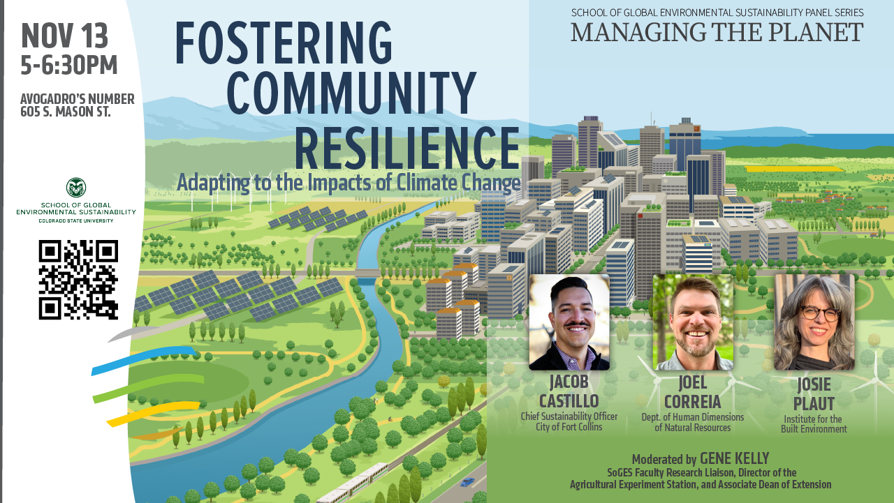 Climate change impacts every facet of society, including but not limited to business operations, public health, safety, and transportation. Each community faces its own set of unique climate challenges and must tailor its actions to protect lives, livelihoods, lands, and waters. Join us for this panel bringing together local government with CSU researchers as they discuss ways to foster community resilience to climate change.