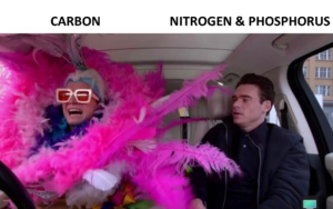 This is where nitrogen and phosphorus come in! Perhaps you’ve heard of nitrogen and phosphorus, as they are some of the elements required for life. Growing up in New Hampshire, I learned these elements as NH-COPS (nitrogen, hydrogen, carbon, oxygen, phosphorus, and sulfur), although I’m sure you learned a different acronym. Nevertheless, this acronym tells us that nitrogen and phosphorus are required for all living things, including plants. In fact, for every 394 carbon’s, an average plant leaf needs 13 nitrogen’s and 1 phosphorus2, although this varies a lot between plant types.