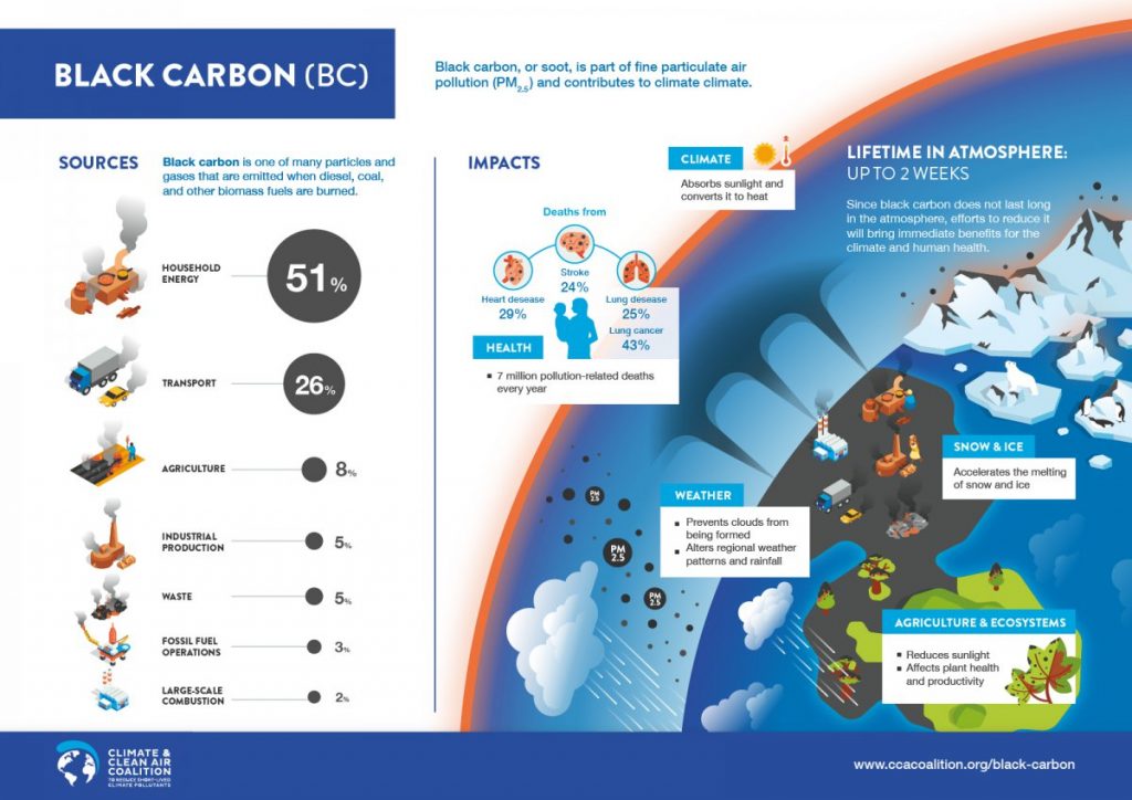 Did you know that black carbon is the second most important warming agent in our atmosphere behind carbon dioxide (CO2)? This is because of black carbon’s enhanced ability to absorb visible light; it actually absorbs nearly a million times more energy per unit mass than CO2. Compounds that can absorb energy are important because they alter the radiative balance of our Earth’s atmosphere. This balance describes how much energy is being reflected back into space versus how much is being absorbed by our atmosphere; a positive change in the balance indicates that we’re taking more energy in (net warming) and a negative balance indicates that we’re reflecting more energy out (net cooling). Net atmospheric warming is problematic for a number of reasons – it leads to crop and vegetation stress which threatens our food security, it causes more intense dry seasons which lead to bigger wildfires that cause severe economic and environmental damage, and it leads to rising oceans levels which threaten existing infrastructure. Not only does black carbon contribute to atmospheric warming, it also contributes to surface warming because it is predominantly removed from the atmosphere by falling out in precipitation or settling naturally on surfaces. When it settles on plants, black carbon negatively affects plant productivity and health; when black carbon settles on snow- and ice-covered surfaces, it significantly accelerates melting.