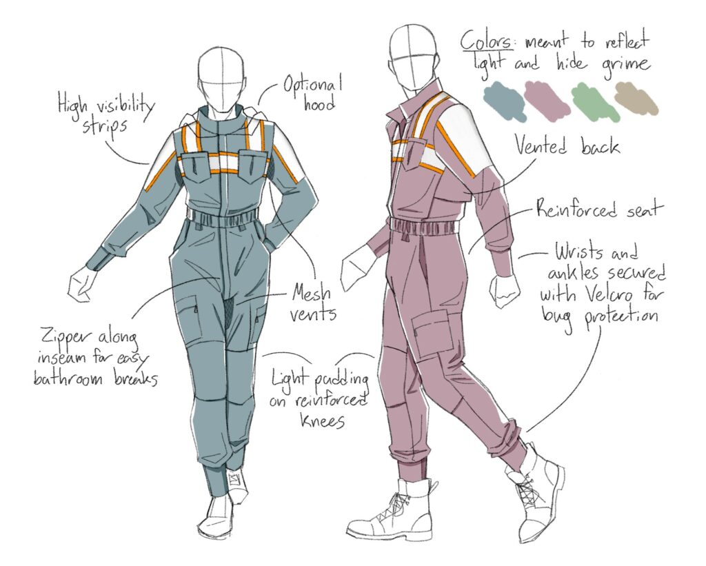 Since heat exhaustion is the greatest danger we face in the field, this design has built-in cooling features: mesh panels under the armpits and between the thighs would help evaporate sweat, and a vented back would allow cooling while not sacrificing sun protection. It may seem uncomfortable to have your skin fully covered, but trust me, a light layer to protect your skin from direct sun is unexpectedly beneficial. Also, the wrists and ankles are secured with Velcro flaps, meaning that bugs will have a harder time sneaking in. Note that the front zipper extends along the inseam, meaning that when you need to take a break to “use the bushes,” you won’t need to take off the whole suit and lose your protection.