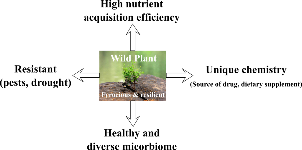 Wild plants as a source of healthy microbiome. Microbiome is a community of microorganisms that inhabits a particular environment. Plants rely on microbiomes for many life-support functions like nutrient acquisition and protection from pests and diseases (Perez-Jaramillo et al., 2018). Microbiomes are majorly affected by plants and the environment; however, plants play active role in recruiting microorganisms in their surroundings which is believed to be driven by their root exudates such as organic acids, amino acids, fatty acids, phenolics, sugars, sterols, nucleotides, and vitamins. The ability of wild plants to efficiently exploit their microbiome was overlooked during domestication, and as a result domesticated plants have lost their ability to recruit microorganisms to their benefit. Therefore, researchers are turning to the wild plants to study their microbiome and understand its genetic regulation (Jaiswal et al., 2020). Furthermore, some studies are now analyzing the microbiome in of healthy wild plant systems and are recommending microbial mixtures for improved yield and disease resistance.