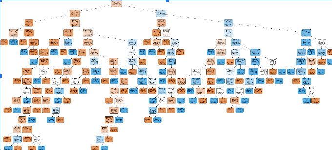 So you’ve asked me a series of questions and I’ve told you whether that chocolate is gross or yummy. Now, do you notice something about the shape of this branching list of questions and answers? It’s kind of in the shape of a tree, right!? We’ve just created what is called a “decision tree”. Decision trees are really easy to interpret because, as we’ve just shown, they mimic a human process of investigation. Notice, however, that we haven’t actually used the decision tree to predict whether I will like new chocolate. Instead, we built this decision tree using information about chocolate I already know. This is called “training our model”. We use a “training dataset” to teach our model to ask the right questions so that it can correctly identify gross and yummy chocolate based on the predictors I have given it. The decision tree above is a very simple example but they can quickly become more complicated, such as the tree below: