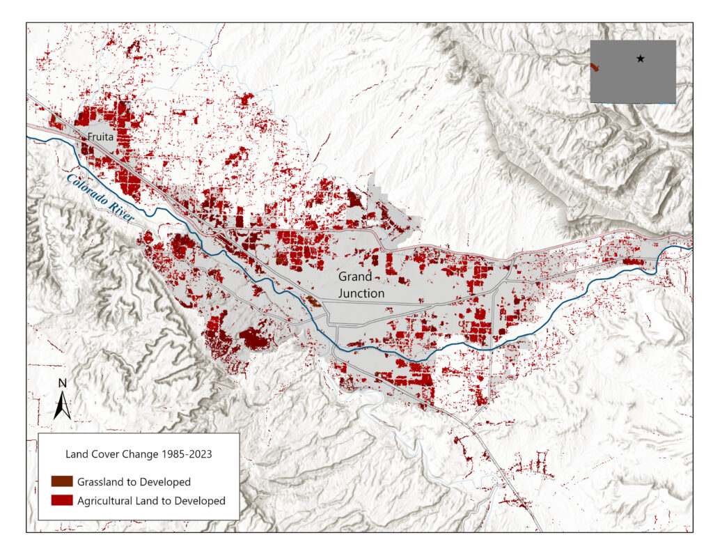 In February 2025, we interviewed 26 producers from family farms who represented a wide range of vegetables, fruit trees and livestock production on the Western Slope. Our team is interested in learning more about the variety of challenges these producers are facing, how they are adapting, and what they need in terms of support to continue adapting. One of the most common challenges we heard about is the ongoing pressure of development and how this is rapidly transforming the area from rural to urban (Welch et al., 2025). To dive deeper, we used a map making software (ArcGIS Pro) to analyze the change in land use over time.