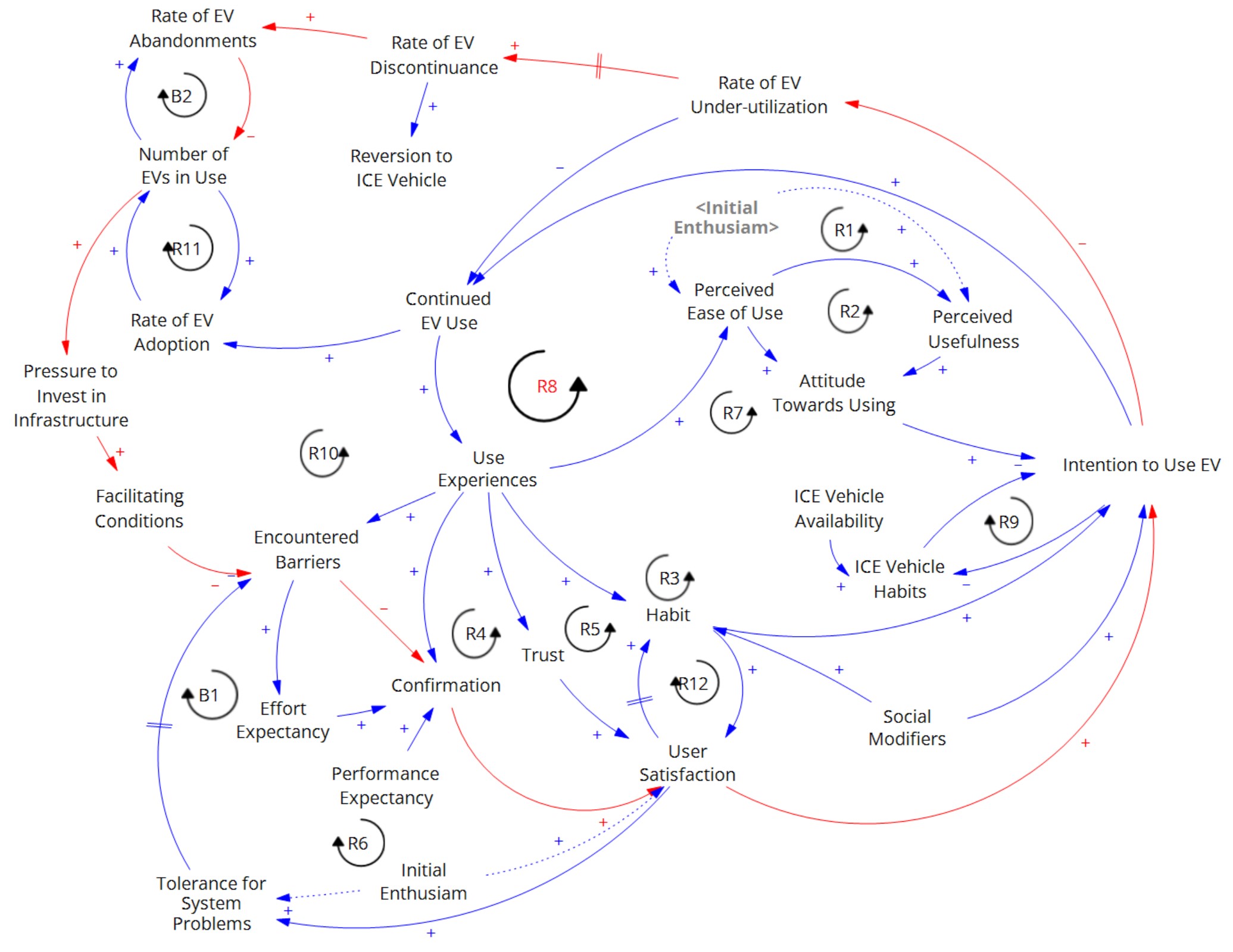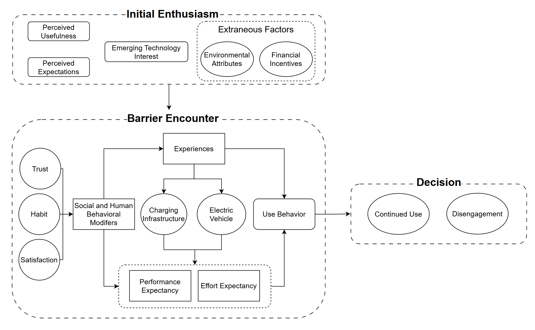 You know how you downloaded that productivity app, used it for about two weeks, and never opened it again? Researchers have developed frameworks to explain that behavior exactly see here, and I am applying those same ideas to EVs. Using those frameworks, I’ve built a model that identifies the factors pushing EV users toward disengagement. Spoiler: charging infrastructure reliability sits right at the center. If you follow the arrows in the figure below, you can see how unmet expectations through confirmation can snowball to giving up on EV use. This model illustrates the role of different factors, addressing questions such as Is using the EV worth the effort, Does the EV still feel useful, and ” Do I trust the EV to get me to where I need to go? These are some of the levers that determine if an EV owner remains or disengages.