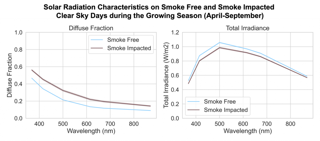To answer our first question, we looked at smoke presence and the average diffuse fraction and total irradiance at six wavelengths. Early results confirm that smoke is changing the light at the surface (figure 2). For all wavelengths, diffuse fraction is higher and total irradiance is lower on smoke impacted clear sky days in the growing season. By looking at clear sky (i.e., cloud free) days, we better isolate the impact of smoke since clouds also affect solar radiation. Since these changes happen throughout the main U.S. agricultural growing season (April-September), our next step will be finding out what happens to crops given to these changes.