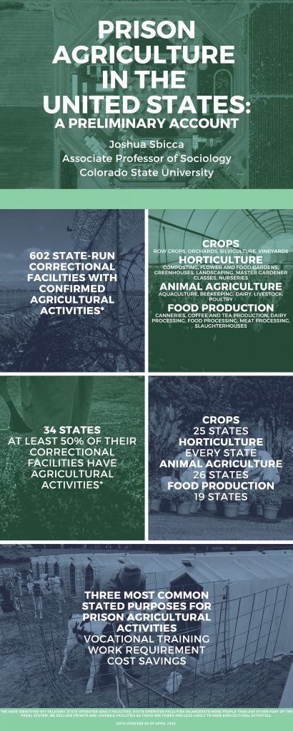 Prison agricultural activities are far more common than most people think. From row crop farming and ranching to gardening and horticulture, it is important to understand that incarcerated people are producing food in correctional facilities throughout the entire United States. Although largely hidden from public view, this work takes place to discipline incarcerated people into new habits of work, reduce the costs of mass incarceration, and relatedly, feed hundreds of thousands of people behind bars. In many cases, the penal system also claims that this work can have therapeutic benefits, provide vocational training, and support the greening of prisons.