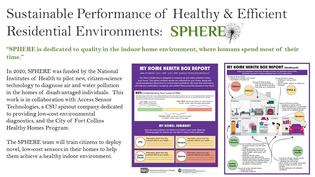 We are developing new technology that will empower individuals to measure air and water quality in their homes and to reduce or eliminate such hazards when detected. Moving forward, the SPEHRE team will train individuals from health disparity populations (those living in poverty or from disadvantaged backgrounds) to deploy the “Home Health Box” (a cutting-edge sensor package for air and water pollution) within their homes for a one-week period. Collected data will be analyzed by CSU/SPHERE researchers and disseminated back to home occupants using a simple infographic report.