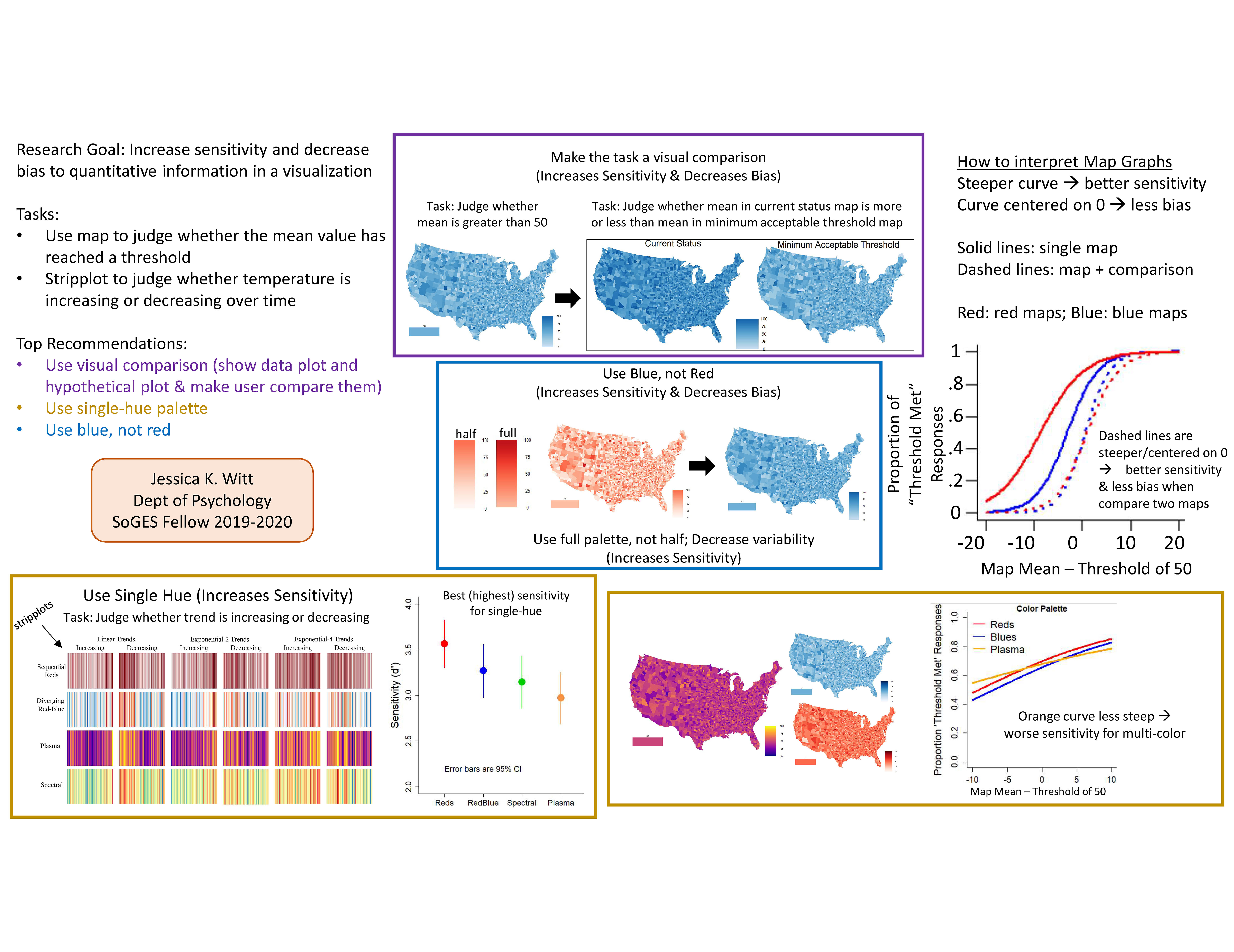 My research question is to determine which data visualization design choices lead the user to have the best sensitivity to the information and the least amount of bias. To answer this question, I conducted empirical studies on human observers across a wide range of visualizations. I distilled their responses into the two components of sensitivity and bias, and recorded which designs promote sensitivity and decrease bias. A big misconception about data visualization is that as long as the data is present, people can comprehend the information. In reality, there’s a lot more to it. For example, I found that choices in how a designer maps color onto the data can have large impacts on comprehension, and that visualizations that used shades of a single color led to the best comprehension.